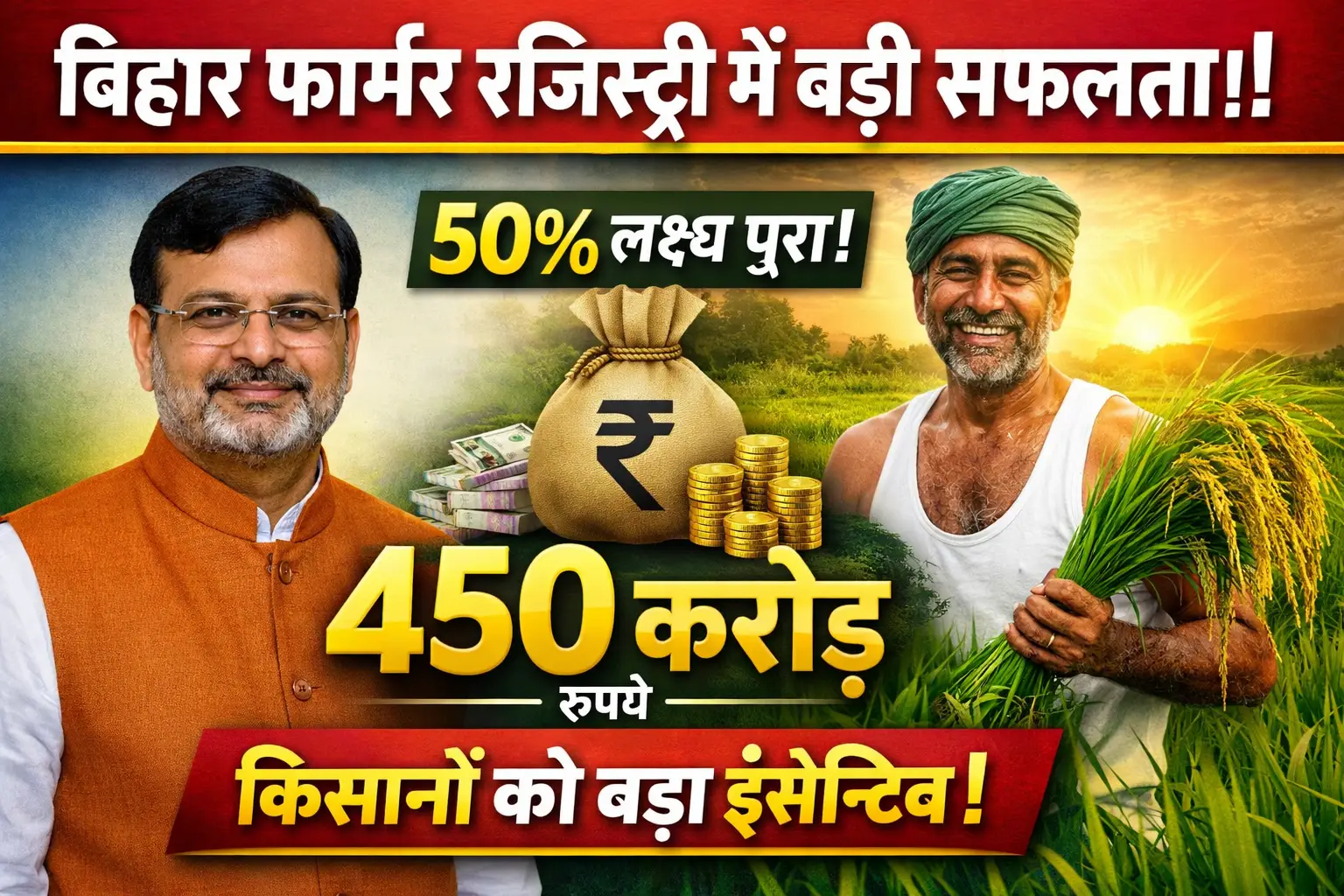 PATNA :- बिहार सरकार के लिए फार्मर रजिस्ट्री अभियान में बड़ी उपलब्धि सामने आई है। उपमुख्यमंत्री सह राजस्व एवं भूमि सुधार मंत्री विजय कुमार सिन्हा ने जानकारी दी कि राज्य ने किसानों के पंजीकरण का 50 प्रतिशत लक्ष्य समय से पहले पूरा कर लिया है। इस उपलब्धि पर केंद्र सरकार बिहार को 450 करोड़ रुपये की दूसरी किस्त प्रोत्साहन (इंसेंटिव) के रूप में देगी।