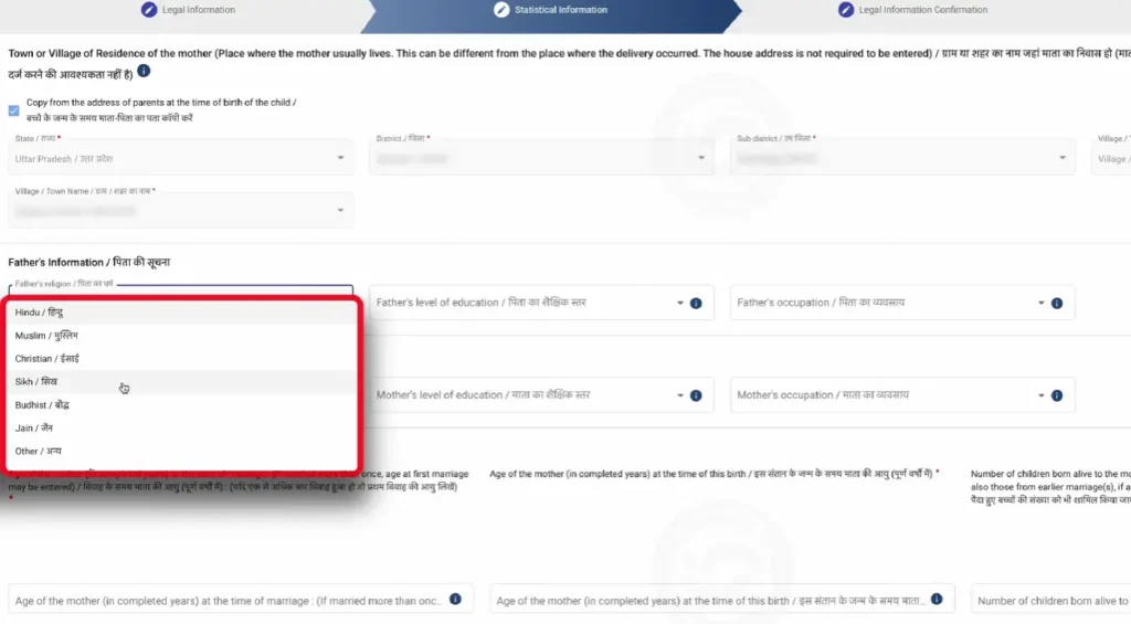 Step 7 :- अगले चरण में आपको बच्चे के माता-पिता से संबंधित सामाजिक और आर्थिक जानकारी देनी होगी। इसमें माता-पिता का धर्म, शिक्षा योग्यता और व्यवसाय/पेशा चुनना होता है। साथ ही, माता की शादी के समय उम्र, बच्चे के जन्म के समय माता की उम्र और कुल जीवित बच्चों की संख्या की जानकारी भी देनी होती है। जन्म से संबंधित अन्य जानकारी में, आपको प्रसव के दौरान उपस्थित व्यक्ति का प्रकार (डॉक्टर/नर्स, पारंपरिक दाई, या रिश्तेदार/अन्य) चुनना होगा। यह विकल्प आपके द्वारा चुने गए ‘जन्म के स्थान’ पर निर्भर करेगा। इसके अलावा, जन्म के समय बच्चे का वज़न और गर्भावस्था की अवधि (सप्ताह में) दर्ज करना अनिवार्य है।