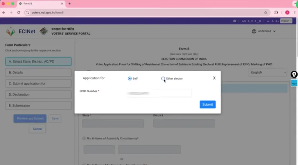 Step 4 :- अब आपके सामने दो ऑप्शन आएगा Self and Other elector अगर आप अपने वोटर कार्ड को ऑर्डर करना चाहते हो तो Self पर सेलेक्ट करना अगर अपने फैमिली में से किसी का PVC Card करना चाहते हो तो Other elector पर सेलेक्ट करना।