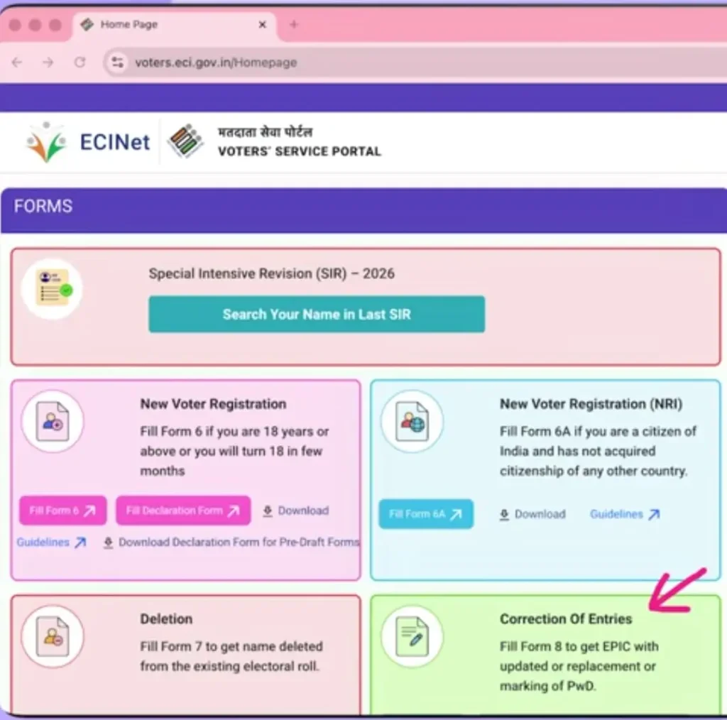Step 3 :- लोगिन करने के बाद “Correction of Entries,” का एक ऑप्शन मिलेगा जिसपर आपको क्लिक कर देना है। क्लिक करने के बाद आपके सामने एक नया ऑप्शन मिलेगा Fill Form Number 8. उसे पर आपको क्लिक करना है।